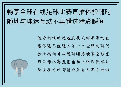 沣东文教园足球比赛的精彩直播吸引了众多观众的目光,成为本地区体育活动的一大亮点。本文将对本次比赛的盛况进行全面回顾,并分享其中的一些精彩瞬间。从赛事的组织安排、选手表现、观众反响及媒体报道四个方面深入探讨,力求为读者呈现一个立体而丰富的赛事体验。在这里,不仅有激烈碰撞带来的紧张感,还有团队合作与拼搏...